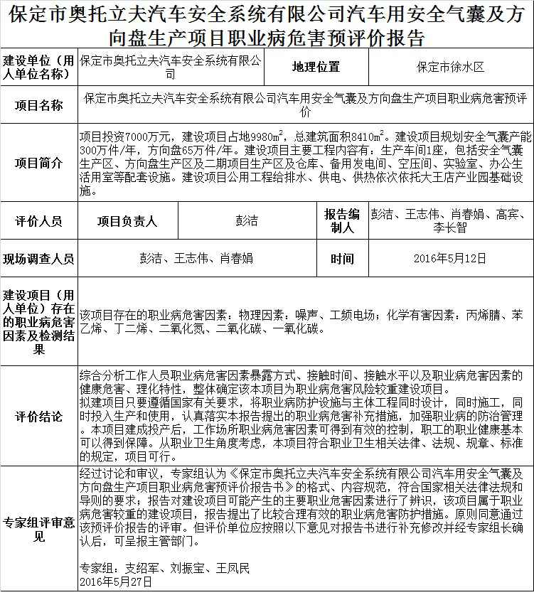 保定市奥托立夫汽车安全系统有限公司汽车用安全气囊及方向盘生产项目职业病危害预评价
